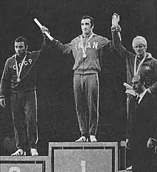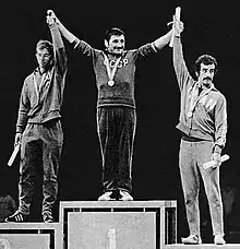 Medal winners of freestyle 62 kg. From left to right, Heinz Stahr, Zagalav Abdulbekov and Mohammad Reza Navaei