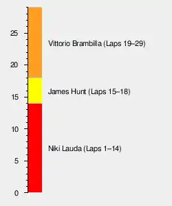 By lap 12, it was obvious that Lauda's car was not set up fully to cope with wet conditions and by lap 15 Hunt stormed by to lead for the fifth time this season. However, this was to be short-lived. The Hesketh's engine was running on only seven cylinders and Brambilla was clambering all over the back of the car. Ahead of them Lunger was driving carefully in his first wet race and could not see the leaders approaching him. Brambilla seized the lead and it took a further two laps for Hunt to finally pass his teammate. Peterson had to pit to replace a faulty visor, whilst the Brabham drivers found they had been racing with one of their own rear tyres and one of their teammates'. Jochen Mass spun out of third place, and soon there was frantic activity between the Grand Prix Drivers' Association and the race officials as to whether the race should continue – it was brought to a halt on lap 29.