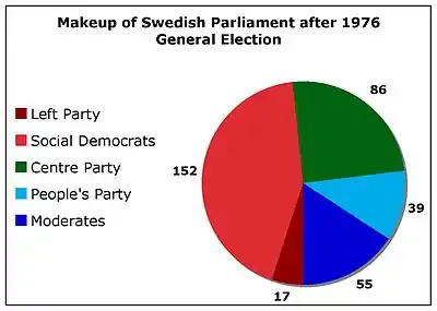 General elections were held in Sweden on 19 September 1976.[1] Although the Swedish Social Democratic Party remained the largest party, winning 152 of the 349 seats in the Riksdag,[2] a coalition government was formed with the Centre Party, the People's Party and the conservative Moderate Party (who won a combined 180 seats), which formed Sweden's first non-socialist government since 1936. Centre Party leader Thorbjörn Fälldin, who had widely been expected to take over the government in the previous election of 1973 (which turned out to bring a 175-175 draw between the left and right blocs), was appointed Prime Minister, the first not from the Swedish Social Democratic Party since Axel Pehrsson-Bramstorp's brief interregnum 40 years earlier.