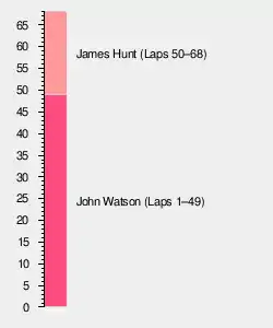 James Hunt had started from pole position with John Watson alongside him. But, Hunt did not get a good start due to clutch problems and dropped back to 4th as a result. This allowed Watson to take the lead into the first corner ahead of Niki Lauda's Ferrari and Jody Scheckter's Wolf. However, as the race had slowly progressed Hunt eventually managed to re-overtake Lauda and Scheckter and re-passed Watson for the race lead as the British drivers were running first and second. But the order of the top 2 did not stay the same as Watson started to slow when his fuel system failed on lap 53 and retired only 8 laps later. With Watson dropping out of contention this promoted Niki Lauda to second and Jody Scheckter to third. But Scheckter was also forced to retire later on when his engine failed on lap 60 which gave Mario Andretti in the leading Lotus third before his engine had also failed 3 laps later but was classified 14th. As Gunnar Nilsson in the remaining Lotus was given 3rd place and stayed there. James Hunt had finally managed to take his first win of the season for McLaren to the delight of the British fans, ahead of championship leader Niki Lauda, Gunnar Nilsson, Jochen Mass in the second McLaren, Hans Joachim Stuck in the remaining Brabham and Jacques Laffite in the only Ligier.