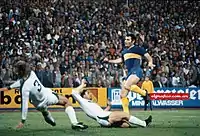 Ernesto Mastrángelo scoring the second goal for Boca Juniors in Wildparkstadion