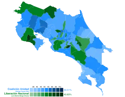 The Left also made a coalition; the three main far-left parties at the Left of PLN; Popular Vanguard, Costa Rican Socialist Party and Revolutionary People's Movement made the United People coalition,[7] nominating former PLN member and doctor Rodrigo Gutierrez. Gutierrez had no possibilities to be president but the coalition did help the Left having a higher voting than usual and a large group in Congress. For many historians this election marks the beginning of Costa Rica's two-party system.[8]