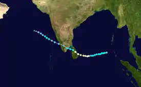 The storm formed on 17 November over the southwest Bay of Bengal. It intensified gradually, reaching a peak intensity of 220 kmph (140 mph),[2] while the Joint Typhoon Warning Center analyzed the storm as a Category 2 equivalent cyclone on the Saffir–Simpson scale on November 23.[3] The cyclone made landfall in Batticaloa at its peak intensity by the same night. It emerged over the Gulf of Mannar on the 24th. That same evening, the storm made its second landfall in Kilakkarai in Tamil Nadu with one-minute sustained winds of 85 kmph (50 mph).[4] The storm then moved back into the ocean around the Kerala coast. It spent its remaining days over Arabian Sea, eventually dissipating on 29 November.