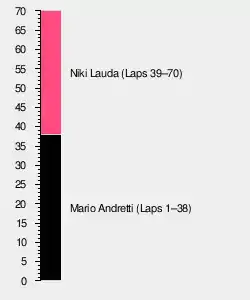 At the start Andretti retained the first place, while Lauda got ahead of Watson; on the second lap he was passed by a fast Riccardo Patrese in the Arrows, and on the third he was passed by the other Lotus of Ronnie Peterson too; the Swede also passed Patrese, but had later to back off due to a tyre puncture. The order then remained the same until lap 20, when Watson was forced to retire by a throttle problem.
