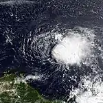 In Dominica, strong winds damaged or destroyed 80% of homes, leaving 75% of the island's population homeless. Agricultural was also severely impacted, with 75% of crops ruined, including a complete loss of bananas.[26] There were 56 deaths and 180 injuries.[7][26] Similar destruction occurred on Guadeloupe and Martinique, with hundreds left homeless and extensive damage to crops. Guadeloupe and Martinique also had $50 million and $100 million in damage, respectively. In Puerto Rico, flooding and high winds combined resulted in $70 million in damage and seven fatalities, four from electrocution.[26] Dominican Republic was lashed with very strong winds and torrential rains.[7][26] Entire villages were destroyed and numerous others were left isolated because of damage or destruction to many roads.[27] Thousands of houses were destroyed, leaving over 200,000 homeless in the aftermath of the hurricane.[7] Additionally, nearly 70% of the country's crops were ruined.[27] Overall, the storm caused at least 2,000 deaths and about $1 billion in damage in Dominican Republic. Minimal impact occurred in the Bahamas, Cuba, and Haiti.[7] In Florida, strong winds left moderate damage, including a downed radio tower, snapping a crane, and deroofing buildings.[28] There were also 10 tornadoes.[29] Damage totaled approximately $95 million.[28] Other states along the East Coast of the United States experienced flooding and tornadoes. The latter was particularly severe in Virginia, with tornadoes causing one death, damaging 270 homes, and destroying three other homes.[30] Throughout the United States, there were 15 deaths and about $320 million in damage.[7]