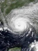 A tropical wave developed into a tropical depression at 12:00 UTC on August 25, while located about 870 mi (1,400 km) southeast of Cape Verde.[7] Moving westward, the depression intensified into Tropical Storm David early the next day. Shortly after attaining hurricane status on August 27, David rapidly deepened. By 12:00 UTC the following day, it was a strong Category 4 hurricane. Thereafter, the storm oscillated in intensity while approaching the Lesser Antilles and struck Dominica late on August 29. with winds 145 mph (230 km/h). After entering the Caribbean Sea, further deepening occurred and at 18:00 UTC on August 30, David peaked with maximum sustained winds of 175 mph (280 km/h). Late on August 31, it curved northwestward and struck Santo Domingo, Dominican Republic at the same intensity.[3]