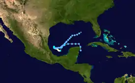 A tropical disturbance formed over the Isthmus of Tehuantepec on August 24.[31] By the following day, the disturbance developed into a tropical depression,[3] operationally classified as the eight of the season. The depression entered the Bay of Campeche on August 25 and headed northward.[31] Around 06:00 UTC the following day, the system peaked with maximum sustained winds of 35 mph (55 km/h).[3] However, on August 28, a ridge of high pressure forced the system to move west-southwestward,[31] causing it make landfall in a rural area of Tamaulipas later that day.[3] The depression brought heavy rainfall to some areas of Mexico, with 18.94 in (481 mm) of precipitation observed in Santa María Xadani, Oaxaca. Rainfall extended northward into Texas, peaking at 4.86 in (123 mm) in McAllen.[31]