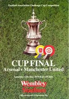 The 1979 FA Cup Final was a football match played on 12 May 1979 at Wembley Stadium. The match was contested by Arsenal and Manchester United. It is regarded as one of the greatest-ever finishes in an FA Cup final.[1][2] For over 85 minutes the game had been unremarkable, with Arsenal taking a 2–0 half time lead through goals from Brian Talbot and Frank Stapleton. In the 86th minute, however, Gordon McQueen scored following a set-piece, and two minutes later Sammy McIlroy dribbled past two Arsenal players to score a dramatic equaliser. With the game poised for extra time, United's celebrations proved short-lived, as Alan Sunderland scored a last-minute winner, making the final result Arsenal 3–2 Manchester United. This match is often referred to as the "Five-minute Final".