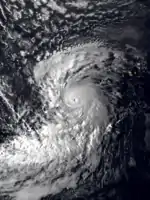 In late September, a cold-core low persisted off the coast of Portugal, moving southwestward. The system gradually developed tropical characteristics as it turned northwestward and executed a loop near the Azores. Eventually, the system organized enough to be designated as a tropical depression on October 4, while just east of the Azores. Shortly thereafter, the depression intensified into Tropical Storm Ivan.[43] However, the National Hurricane Center did not initiate advisories on Ivan until late on October 5.[44] Ivan moved largely in tandem with the upper-level low above it, while its southwest movement was caused by a building ridge to its north.[43] Late on October 5, an eye developed,[45] and Ivan was upgraded to a hurricane on the following day.[43]