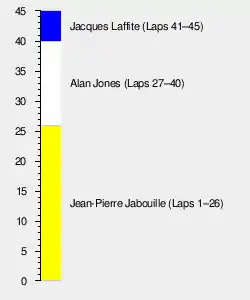 The very high speed Hockenheimring favored more powerful turbocharged engines, and was expected to be a Renault circuit. Jean-Pierre Jabouille led early with Arnoux third behind Jones. Both engines in the Renault RE20s failed within a lap of each other leaving Jones to lead until he stopped after he punctured a tyre after the second chicane, dropping behind Laffite and Reutemann.