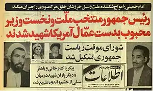 The office of Mohammad Javad Bahonar, Prime Minister of Iran, was bombed on 30 August 1981 by the People's Mujahedin of Iran (MEK),[4][5] killing Bahonar, President Mohammad Ali Rajai, and six other Iranian government officials.[6] The briefcase bombing came two months after the Hafte Tir bombing, which killed over seventy senior Iranian officials, including Chief Justice Mohammad Beheshti, then Iran's second-highest official.