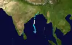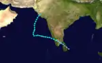 The monsoon trough spawned a tropical depression just east of Sri Lanka on October 25. The depression tracked northwestward, becoming a tropical storm on the 27th over southern India according to the JTWC. Over the Arabian Sea, it turned northeastward where, after reaching a peak of 120 km/h (75 mph) winds, it hit western India on November 2 as it recurved northeastward. The IMD last reported the system on November 3.[3] Nearly 5700 huts were reported to be damaged due to gust winds over Gujarat at the time of landfall.
