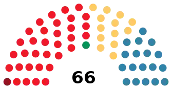 The PSOE had initially obtained 34 seats, the absolute majority, but a new count in Zaragoza following a number of claims resulted in the PSOE's 17th seat in the constituency being awarded to the People's Coalition by few votes.[3][4] As a result of the election, PSOE candidate Santiago Marraco was elected by the Cortes as new president of the General Deputation of Aragon.[5][6] The election remains the only occasion to date in which a party has obtained 50% or more of seats on its own in an Aragonese regional election.