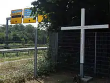 ![]() A white, wooden cross in memory of the Jürges family killed in the Starfighter crash; parts of the aircraft hit their car on the highway that can be seen in the background. | |