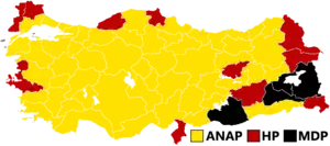 General elections were held in Turkey on 6 November 1983, the first since 1977 after democratic rights were abandoned after the military coup of 1980. The National Security Council banned the previous political parties from participating, leading to the establishment of new parties.[1] Turgut Özal's Motherland Party (ANAP) won a significant victory in this elections by gaining 45.14% of the votes. This victory was the starting point of a rapid change in the structure of the state and society in Turkey.[2] Voter turnout was 76.6%.[3]