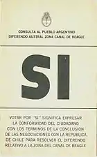 A non-binding referendum on resolving the Beagle conflict was held in Argentina on 25 November 1984.[1] Voters were asked whether they approved of the government's negotiated settlement with Chile, which would result in Argentina recognising the Picton, Lennox and Nueva islands as being Chilean territory. Although the plebiscite was not binding, President Raul Alfonsin declared that he would respect the outcome of the vote. The proposal was approved by 82.6% of voters, with a turnout of 70%.