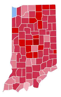 | Kosciusko | 17,560 | 77.88% | 4,877 | 21.63% | 48 | 0.21% | 62 | 0.27% | 12,683 | 56.25% | 22,547 |