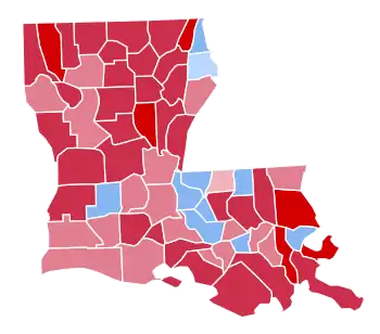 The presidential election of 1984 was a very partisan election for Louisiana, with just under 99 percent of the electorate voting only for either the Democratic or Republican parties, though eight parties appeared on the ballot.[1] All but two parishes gave either Mondale or Reagan a majority; East Feliciana gave Reagan a narrow plurality, and Madison Parish gave Mondale a narrow plurality. Of Louisiana's 64 parishes, a vast majority (53) gave Reagan a majority; nine gave Mondale a majority. Mondale's best showing was in Orleans Parish, the state's largest parish, where he got 57.9% of the vote; Reagan's was in thinly-populated LaSalle Parish, where he got 78.8% of the vote. However, Reagan exceeded 70% in eight parishes (including the highly populated New Orleans suburb of Jefferson Parish and the moderately populated New Orleans suburb of St Tammany Parish). This was the first election since 1944 in which Louisiana supported the same party as it did in the previous election.