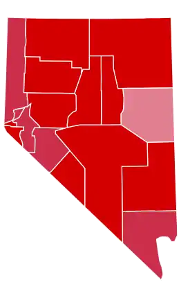 Reagan won Nevada by a resounding landslide margin of 34%. His vote share of 65.9% made it his tenth-best state nationally, and was the highest vote share any nominee of either party had won in the Silver State since 1936. The Mountain West as a whole had begun trending Republican in 1952,[14] but Nevada remained more competitive than other states in the region through the 1960s and 1970s, being one of two states in the region (along with New Mexico) to vote for Kennedy in 1960, giving Nixon a plurality in 1968, and voting for Ford by just 4.4% in 1976. A dramatic shift came with Reagan's candidacy, however, as, in 1980, Nevada gave Reagan nearly as high a vote share as it had given Nixon in his 1972 landslide. Reagan improved his vote share still further in 1984. He carried every county in the state, including the largest county, Clark County (home to Las Vegas), which had typically voted Democratic from its founding in 1909 through 1976. Not only did he carry Clark, but he got a higher vote share in it than he did nationally, becoming the first nominee of either party to crack 60% in the county since 1964. He also won over two-thirds of the vote in the state's second population center, more typically Republican Washoe County (Reno). Only in rural and sparsely-settled White Pine County did Reagan fall below 60%, and even here he won by double digits. In eleven counties (including the state's third-largest county equivalent, Carson City), Reagan broke 70%.