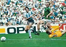 José Luis Brown opened the scoring for Argentina in the 23rd minute with a header after a free-kick from the right and it stayed at 1–0 until half-time. 10 minutes into the second half, Jorge Valdano doubled Argentina's lead with a low side foot finish after cutting in from the left past the advancing goalkeeper. Karl-Heinz Rummenigge pulled a goal back in the 74th minute from close range for West Germany, his first goal in the tournament. West Germany then equalised in the 83rd minute, with Rudi Völler scoring with a header from close range to seemingly salvage the game. Although Diego Maradona was heavily marked by Lothar Matthäus the entire game, his superb pass to Jorge Burruchaga in the 86th minute allowed Argentina to regain the lead at 3–2 when he slid the ball past the advancing goalkeeper from the right and into the corner of the net.[3][4]