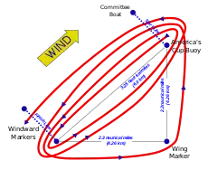 The Fremantle Fairway Buoy 31°57′9.0″S 115°38′48.12″E[18] was renamed the "America's Cup Buoy" for the duration of the event and marked one end of the start and finish lines for each America's Cup race.[8] The buoy is a permanent navigation marker used for shipping in and out of Fremantle harbour and is located 8 nautical miles (15 km) west-north-west of the harbour, in Gage Roads[19] or 5.5 nautical miles (10.2 km) due west of City Beach. Races in the challenge and defence elimination trials used other markers in the general vicinity.