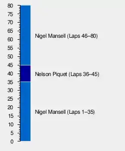 Piquet was about 20 seconds behind Mansell, but on the final laps he was gaining at two seconds a lap. With seven laps to go, the gap was reduced to just 13 seconds, but Mansell paced himself to win by 7.7 seconds. Johansson had fought courageously up to sixth place after two pit stops to repair damages on his McLaren, but retired just five laps from the chequered flag.