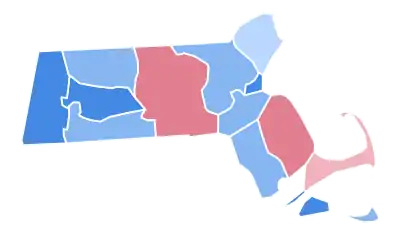 As of 2021, this was the last time that the cities of Amesbury, Attleboro, Beverly, Braintree, Brockton, Franklin, Leominster, Marlborough, and Methuen and the towns of Abington, Alford, Auburn, Avon, Ayer, Barnstable, Massachusetts, Bedford, Bernardston, Bolton, Boxborough, Buckland, Burlington, Canton, Carlisle, Charlemont, Chelmsford, Clinton, Cummington, Danvers, Dedham, Dennis, Erving, Essex, Florida, Gosnold, Grafton, Groton, Hancock, Harvard, Harwich, Hawley, Holbrook, Holliston, Hopedale, Hudson, Ipswich, Littleton, Longmeadow, Manchester-by-the-Sea, Mansfield, Marblehead, Marion, Mattapoisett, Medway, Milton, Mount Washington, Needham, New Ashford, New Salem, Newbury, Northborough, Norton, Peru, Petersham, Plymouth, Reading, Rockland, Savoy, Sheffield, Shelburne, Shirley, Shrewsbury, Southborough, Southampton, Stow, Sudbury, Wakefield, Wellesley, West Newbury, Westborough, Westford, Westhampton, Weston, Winchester, Windsor, and Yarmouth voted Republican.