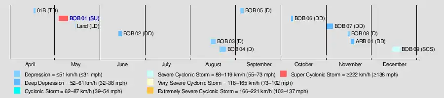 | ARB 01 | November 16–18 | Deep Depression | 55 km/h (35 mph) | 1,007 hPa (29.74 inHg) | None | Unknown | Unknown | [9] |