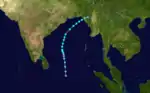 On December 14, the IMD reported that a depression had developed within the Intertropical Convergence Zone over the southern Bay of Bengal.[9] Over the next day the system moved north-westwards and gradually developed into a cyclonic storm, as the JTWC initiated advisories on the depression and assigned it the designation Tropical Cyclone 04B.[9][2] The system subsequently continued to intensify, as it recurved and moved through a break in the subtropical ridge of high pressure.[7][2] Late on December 16, the JTWC reported that the cyclone had peaked as a tropical storm, with 1-minute wind speeds of 85 km/h (55 mph).[12] Early on December 17, the IMD reported that the system had peaked as a Severe Cyclonic Storm with 3-minute wind speeds of 100 km/h (60 mph).[9] The system subsequently started to weaken later that day, as it encountered increasing upper-level wind shear associated with the mid-latitude westerlies.[2] During the next day the system weakened into a Cyclonic Storm, before it degenerated into a depression.[9] The system subsequently made landfall on Bangladesh near Cox's Bazar, before it was last noted over Myanmar by the JTWC during December 19.[9][12] The system caused some deaths and damages in both Bangladesh and Myanmar.[4]