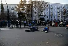 While increasing the blockade around Tbilisi, Tengiz Sigua and Tengiz Kitovani offer a peace proposal to Gamsakhurdia on 24 December. The plan offers to treat members of government with safe conduct in exchange of the immediate resignation of the President, an offer refused by the head of state.[63] At the end of the day, some international reports estimated the number of dead between 23 and 50 Georgians and 168 to 200 injured. Russian television shows footage of civilians evacuating the bodies of victims during the evening.[63] On 25 December, the number of dead grows to 30-80 victims, according to US media.[66]