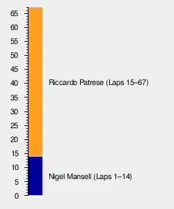 On lap 15, Patrese passed his team-mate, who was having engine overheating concerns, for the lead. Mansell fell back towards Senna, Piquet, de Cesaris, Moreno and Alesi (who had spun), but eventually the concerns faded and the Englishman pulled away again. Alesi passed Moreno and de Cesaris for fifth, only for his clutch to fail on lap 43, team-mate Prost having dropped out on lap 17 with an alternator failure. Piquet's race ended on lap 45 with a broken wheel bearing, and when Moreno had a pit stop go wrong, Bertrand Gachot found himself fifth in the second Jordan, before spinning off.