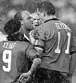 Game II of 1991 is remembered for a number of dramatic incidents. Played in drenching rain, the game exploded into violence before half-time when volatile New South Wales forward Mark Geyer chopped down on Queensland hooker Steve Walters in a tackle. Prop Andrew Gee ran in to assist his teammate, sparking a brawl which involved most players from both teams. When the dust settled, referee David Manson issued a handful of cautions, but as players left the field for half-time, Queensland captain Wally Lewis continued to goad Geyer,[8] clearly expecting the New South Wales forward to be antagonised into a violent response right in front of Manson that would have him sent off. This became a lasting image in Australian sporting folklore.[9][10]