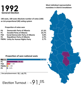 Parliamentary elections were held in Albania on 22 March 1992, with a second round of voting for eleven seats on 29 March.[1][2] The result was a victory for the opposition Democratic Party of Albania, which won 92 of the 140 seats. After the election Aleksandër Meksi became Prime Minister and Sali Berisha became President.