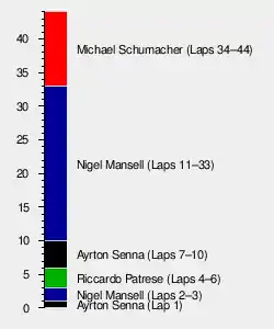 The 44-lap race was won by Michael Schumacher, driving a Benetton-Ford. This was the first Grand Prix win for a German driver since Jochen Mass at the 1975 Spanish Grand Prix, and the first of an eventual record 91 Grand Prix wins for Schumacher (since eclipsed by Lewis Hamilton). New World Champion Nigel Mansell finished second in his Williams-Renault with teammate Riccardo Patrese third, thus securing the Constructors' Championship for Williams.