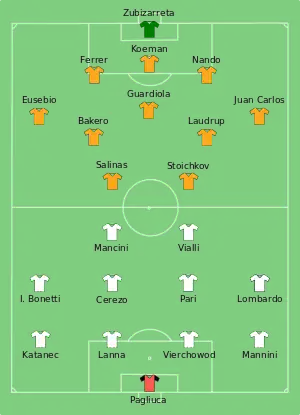 The 1992 European Cup Final was a football match held on 20 May 1992 at Wembley Stadium, London, between Sampdoria of Italy and Barcelona of Spain. Barcelona won the game 1–0 after extra time, thanks to a Ronald Koeman free kick, to record their first triumph in the competition. It was the first to have a group stage involving the eight second-round winners split into two groups, and the winner of each one met in the final. In doing so, they became the second Spanish club to win the tournament and the 19th overall. This was the last final before the competition was re-branded as the Champions League. The final is, as of 2021, the most recent in which both of the finalists entered a European Cup/UEFA Champions League final having not won any of the previous finals.