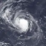 Late on July 15, Hurricane Frank passed about 175 mi (280 km) south of Socorro Island. A station on the island reported winds of 67 mph (107 km/h), which indicated that the hurricane had a large wind field.[40] Slow intensification continued, and Frank intensified into a major hurricane, or a Category 3 on the Saffir-Simpson Hurricane Scale, on July 17.[2] By that time, the eye had become well-defined,[41] and later became surrounded by a ring of deep convection. On July 18, Frank reached its peak intensity of 145 mph (230 km/h) well to the west-southwest of the Baja California peninsula.[42] By July 20, winds dropped below major hurricane intensity, and by the evening, Frank was just a Category 1 hurricane.
