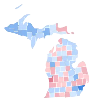 Michigan was won by Governor Bill Clinton (D-Arkansas) with 43.77% of the popular vote over incumbent President George H. W. Bush (R-Texas) with 36.38%. Businessman Ross Perot (I-Texas) finished in third, with 19.30% of the popular vote.[2] Clinton ultimately won the national vote, defeating incumbent President Bush.[3] This was the first time that a Democratic presidential candidate carried the state since Hubert Humphrey in 1968. It would not vote Republican again until 2016. As of the 2020 presidential election, this is the last time that Oakland County voted for a Republican presidential candidate and the last time that Charlevoix County voted for a Democratic presidential candidate.[4] Michigan voted most similarly to the national results of the election.