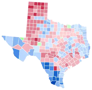 Clinton remains the last Democratic candidate to carry the following counties: Crockett, Concho, McCulloch, Coleman, Mills, Throckmorton, Briscoe, Hill, Freestone, Henderson, Jack, Clay, Montague, Franklin, Lamar, Upshur, Angelina, Hardin, Liberty, Madison, Polk, San Jacinto, and Houston. Hays County, which Clinton won in 1992, would not vote Democratic again until 2020.[4]