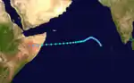 The JTWC began monitoring an area of thunderstorms on November 13 in the south-central Arabian Sea. A day later, the system organized into a low-pressure area, before developing into a depression on November 15, as classified by the IMD. On the same day, the JTWC classified the system as Tropical Cyclone 05A. The system moved slowly at first before beginning a general westward motion, steered by a ridge to the north. Convection organized around the center, signaling intensification. On November 16, the IMD upgraded the depression to a deep depression, and later cyclonic storm. The storm fluctuated in intensity until November 18, when a more pronounced strengthening trend began. A day later, the IMD upgraded the storm to a very severe cyclonic storm, estimating 3 minute winds of 120 km/h (75 mph), based on a Dvorak rating of 4.0. The JTWC meanwhile estimated peak 1 minute winds of 110 km/h (70 mph). The storm weakened significantly as it approached the Horn of Africa. On November 20, the storm made landfall in eastern Somalia near Eyl. The storm rapidly dissipated over land.[1][2]