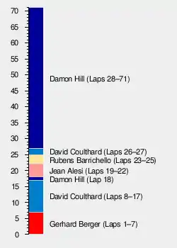 The 71-lap race was won by Damon Hill, driving a Williams-Renault. Teammate David Coulthard finished second, achieving his first podium finish, with Mika Häkkinen third in a McLaren-Peugeot. The win, Hill's fifth of the season and third in succession, enabled him to move within one point of Drivers' Championship leader Michael Schumacher, while the 1-2 finish allowed Williams to take over the lead of the Constructors' Championship from Benetton.