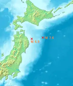 The 1994 offshore Sanriku earthquake (Japanese: 三陸はるか沖地震 Sanriku Haruka Okijishin) occurred on December 28, 1994, at 12:19 UTC (21:19 local time). This was a magnitude Mw 7.7 earthquake with epicenter located in the Pacific Ocean at about 180 km east of Hachinohe, Aomori (haruka-oki means "far offshore").[2][3] The intensity reached shindo 6 in Hachinohe, Aomori, about 187.6 km from epicenter. It could be felt in Tokyo, about 632.9 km from epicenter, with shindo 2.[4] The Japanese Meteorological Agency put the magnitude at MJMA 7.5.[5] Slip associated with this earthquake continued for more than a year and it has been termed an 'ultra-slow earthquake'.[6]