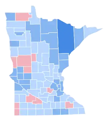 As of the 2020 presidential election, and despite the state’s long Democratic streak – having not voted Republican since 1972 – this is the most recent election that the Republican candidate received less than forty percent of the vote in a presidential election, the most recent in which the Democratic candidate won more counties than the Republican one, and the most recent when Anoka, Becker, Benton, Cass, Chisago, Clearwater, Cottonwood, Crow Wing, Dodge, Faribault, Goodhue, Hubbard, Isanti, Jackson, Kanabec, Kandiyohi, Lake of the Woods, Le Sueur, Lyon, Martin, McLeod, Meeker, Mille Lacs, Morrison, Nobles, Renville, Scott, Sherburne, Sibley, Stearns, Steele, Todd, Wabasha, Waseca, and Wright Counties voted for a Democratic presidential candidate.[3] This is the only time since 1952 that Martin County voted for a Democratic presidential candidate.