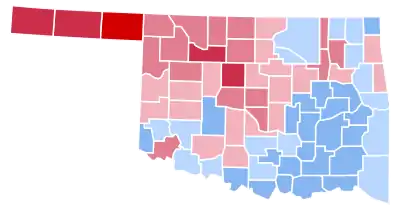As of the 2020 presidential election, this is the last election in which Oklahoma was considered competitive at the presidential level, as Republicans would easily capture the state's electoral votes with over 60% of the popular vote in every election afterward.[2] It is also the last time a Democratic presidential candidate carried any of Oklahoma’s congressional districts (in this case, the Second and Third Districts in the rural east). This is the most recent election in which Oklahoma was decided by a single-digit margin, and the last time Democrats received more than 40% of the vote in Oklahoma. As of the 2020 election, this was the last election in which a Democratic presidential candidate carried the entirety of the Choctaw Nation, a majority of the Chickasaw, Cherokee and Creek Nations, and the counties which contained the Seminole, Pawnee and Osage Nations.