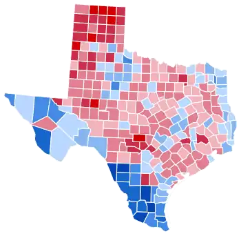 As of the 2020 presidential election, this is the last time a Democratic presidential candidate won the following counties: Hudspeth, Pecos, Terrell, Ward, Swisher, Hall, Cottle, Hardeman, Foard, Baylor, Knox, Haskell, Stonewall, Kent, Dickens, Crosby, Jones, Fisher, Nolan, Mitchell, Menard, Comanche, Palo Pinto, Bastrop, Caldwell, Nueces, San Patricio, Refugio, Bee, Karnes, Atascosa, Burleson, Milam, Falls, Limestone, Navarro, Waller, Grimes, Galveston, Trinity, Orange, Jasper, Tyler, Sabine, San Augustine, Shelby, Panola, Harrison, Marion, Cass, Bowie, Camp, Titus, Red River, Rains, Hopkins, Delta, and Fannin.[3] This would be the last election until 2016 in which the margin of victory for a Republican in Texas would be in the single digits, and the most recent one when the Republican candidate's vote percentage was held to only a plurality. This is also the last time a Democrat won a county in the Texas Panhandle.