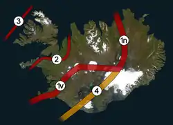 Parts of two volcanic zones of Iceland are placed under Vatnajökull, ie. the very active East Volcanic Zone (connected to Rifting at the Divergent plate boundary in Iceland[9]), responsible for the highest number of eruptions after deglaciation[10] and with the mantle plume probably under Bárðarbunga, ie. under Vatnajökull.[11] "More than 80 eruptions occurred during the last 800 years in Vatnajökull."[12] There is also the much less active Öraefi Volcanic Belt, a flank zone mostly under the eastern part of Vatnajökull.[9][13] It is thought that due to climate change, Vatnajökull has lost about 10% of its mass since the end of the 19th century. Measurements showed an accentuated and even accelerating rate of glacio-isostatic uplift.[11] This could lead to increased magma production (so called decompression melt production), because the "pot lid" formed by the glaciers and their weight will be absent in the future, and eruption frequency could increase as a consequence.[14]