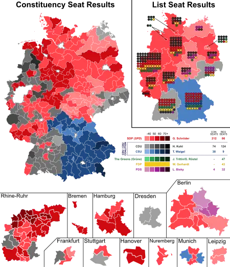 Federal elections were held in Germany on 27 September 1998 to elect the members of the 14th Bundestag. The Social Democratic Party emerged as the largest faction in parliament for the first time since 1972, with its leader Gerhard Schröder becoming Chancellor.