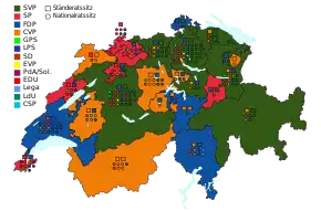 | Zürich | 34 | 780,462 | 353,340 | Swiss People's Party | 3,864,173 | 13 | |