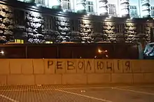 The opposition announced a national strike and launched construction of a tent city on Maidan Nezalezhnosti. Writer Irena Karpa also encouraged the nation to go on general strike – to skip work, boycott Russian products and continue the protests.[34] Opposition leaders stated that Yanukovych is planning on declaring a state of emergency on 2 December.[34] Klitschko denounced the attempt to storm the president's office as an effort to provoke the government into declaring a state of emergency. He called for everyone to stay on the square in a peaceful protest.[39] He later called for the president's resignation, stating "They stole the dream. If this government does not want to fulfill the will of the people, then there will be no such government, there will be no such president. There will be a new government and a new president," he said to cheering crowds.[40] Meanwhile, Svoboda leader Oleh Tyahnybok called for a national strike and in an official release called for a "social and national revolution," saying a revolution has started in Ukraine.[41] Opposition leader Yuriy Lutsenko also called for a revolution to take place, saying "Our plan is clear: this is not a rally, not an action. This – is a revolution," and called to complete the revolutions which took place in 1991 and 2004.[42]