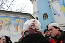 On the night of 30 November 2013 at 04:00, armed with batons, stun grenades, and tear gas, Berkut special police units attacked and dispersed all protesters from Maidan Nezalezhnosti while suppressing mobile phone communications.[1] The police attacked not only the protesters (most of whom didn't or failed to put up resistance) but also other civilians in the vicinity of Maidan Nezalezhnosti, when the Berkut forces chased unarmed people several hundreds of meters and continued to beat them with batons and feet.[2] Initially, 35 people were injured as a result of the militia raid, including a Reuters cameraman and a photographer.[3][4] Other protesters were detained.[1] Most of the protesters were students.[4] At 09:20 Berkut besieged the St. Michael's Golden-Domed Monastery where approximately 50 Euromaidan activists, including the injured, found sanctuary.[1][5] Police spokeswoman Olha Bilyk justified the police raid by saying that protesters were interfering with preparations to decorate the square for the Christmas and New Year's holidays, and accused them of throwing stones and burning logs.[6] Minister of Internal Affairs Vitaliy Zakharchenko later apologized and claimed "riot police abused their power" and promised a thorough investigation.[7] Via state television he added "if there are calls for mass disturbances, then we will react to this harshly".[7]
