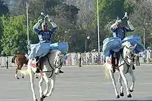 In 1999, the regiment was relocated to its current stables in Camp San Isidro in the western city of Quillota, Valparaiso Region, wherein it was reassigned the duties of being the travelling escort to the President, merging the Mounted Ceremonial Troop to it.[2] Today it maintains the primary purpose of protocol and ceremonial public duties as the most senior regiment of cavalry of the modern day Chilean Army, and one of only 2 regiments left standing in the role of mounted cavalry. Alongside being the travelling escort unit, it maintains guards at the Plaza de la Ciudadanía in Santiago monthly for flag raising ceremonies held there. The regiment's change of command ceremony is the only one in the army wherein most of it is done while mounted, reflecting the long traditions of the Chilean Army cavalry.[3]